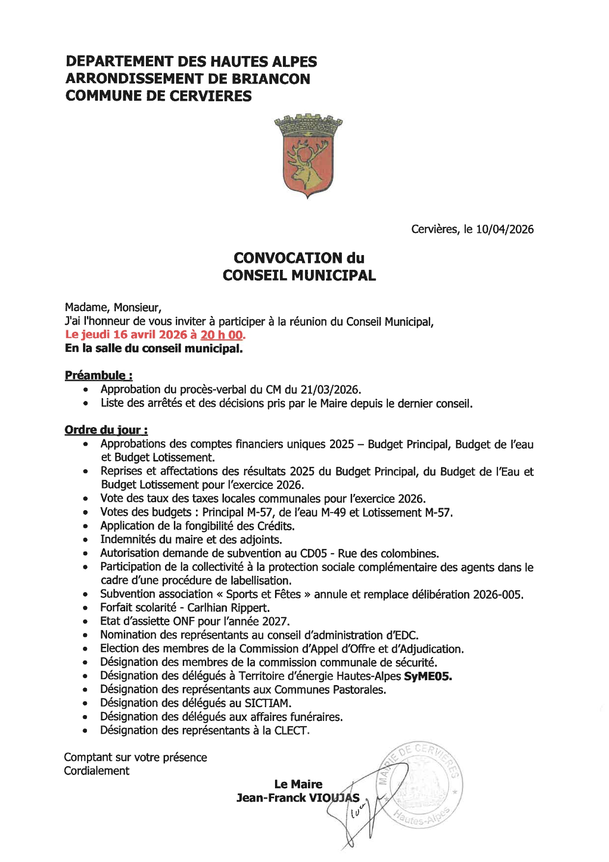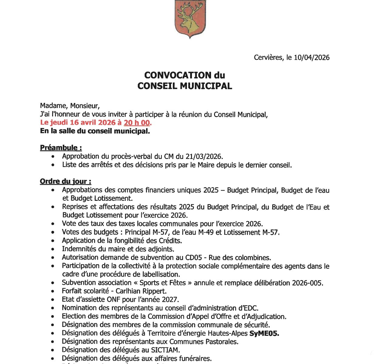 La prochaine réunion du conseil municipal aura lieu le 16 avril 2026 à 20h00